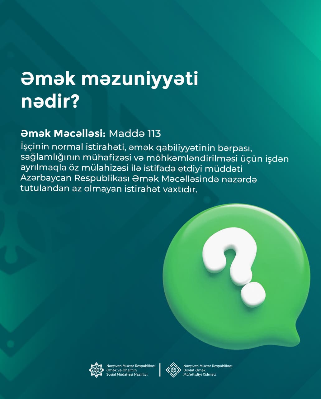 İşçinin normal istirahəti, əmək qabiliyyətinin bərpası, sağlamlığının mühafizəsi və möhkəmləndirilməsi üçün işdən ayrılmaqla öz mülahizəsi ilə istifadə etdiyi müddəti Azərbaycan Respublikası Əmək Məcəlləsində nəzərdə tutulandan az olmayan istirahət vaxtıdır.