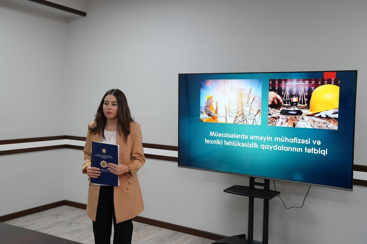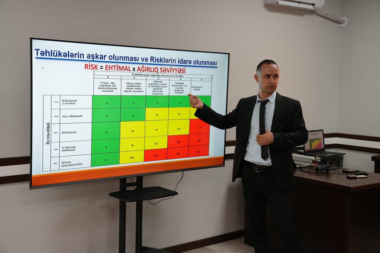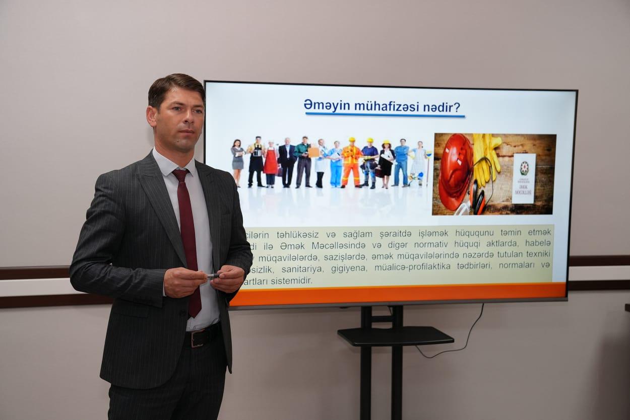 “İş yerlərində əməyin mühafizəsi və texniki təhlükəsizlik”, “İstehsalatda baş verən bədbəxt hadisələrin qeydiyyata, uçota alınması və istehsalatda baş verən bədbəxt hadisələrin və peşə xəstəliklərinin icbari sığortası” mövzularında maarifləndirici təlim keçirilib.