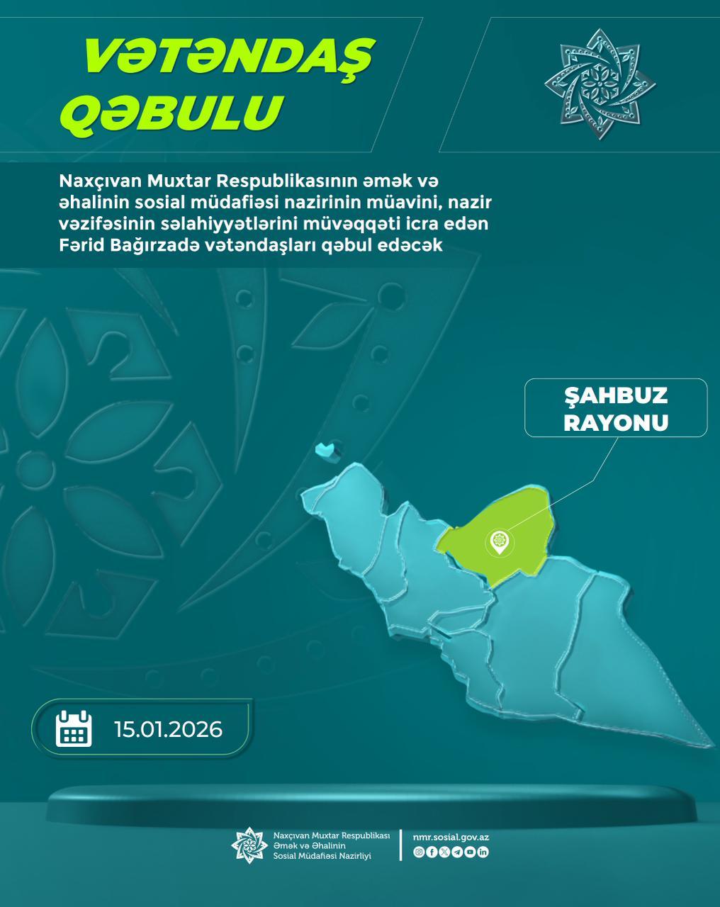 Naxçıvan Muxtar Respublikasının əmək və əhalinin sosial müdafiəsi nazirinin müavini, nazir vəzifəsinin səlahiyyətlərini müvəqqəti icra edən Fərid Bağırzadə yanvarın 15-də Şahbuz rayonunda vətəndaşları qəbul edəcək.