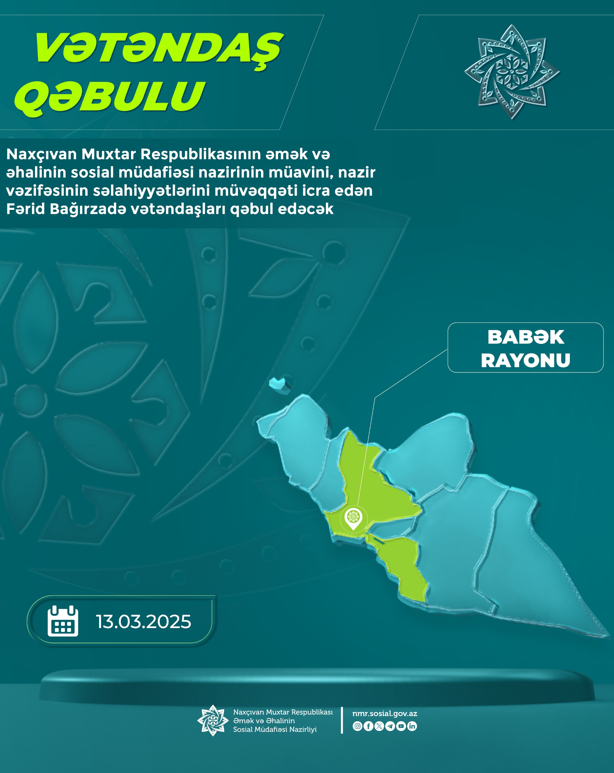 Naxçıvan Muxtar Respublikasının əmək və əhalinin sosial müdafiəsi nazirinin müavini, nazir vəzifəsinin səlahiyyətlərini müvəqqəti icra edən Fərid Bağırzadə vətəndaşları qəbul edəcək